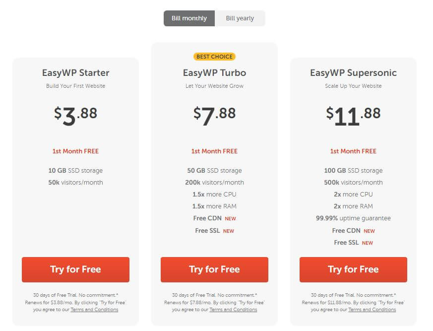 - EasyWP Turbo: Charges you $7.88/mo and incorporates 50 GB SSD storage, 1.5x more RAM, 1.5x more CPU, Free CDN, Free SSL, and handles 200k visitors/mo.