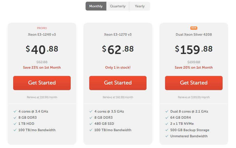 - Xeon E-2236: Priced at $62.88/mo and receives you 4 cores @ 3.5 GHz, 16 GB DDR3, 2 x 480 GB SSD, and 100 TB/month bandwidth.