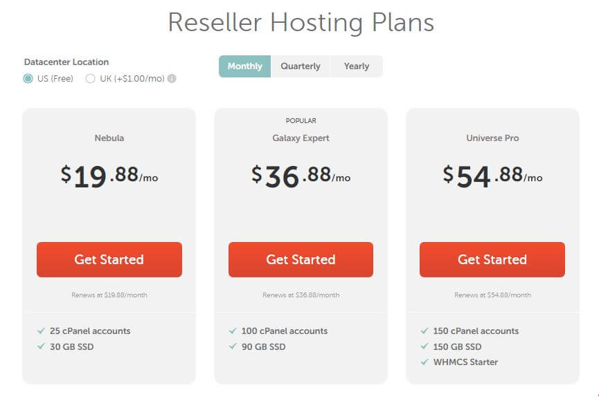 - Universe Pro: You’ll pay $54.88/mo for the pack that gains you 150 Cpanel accounts, 150 GB SSD storage, WHMCS starter.