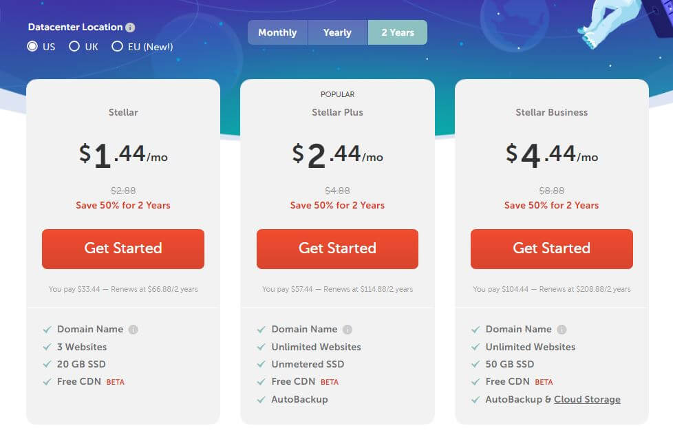 - Stellar Plan: The entry-level plan starts at $1.44/mo and includes a free domain name, 20GB SSD storage, free domain (not .com), free CDN and up to 3 websites can host.
